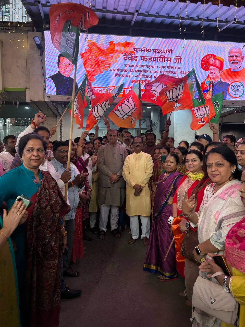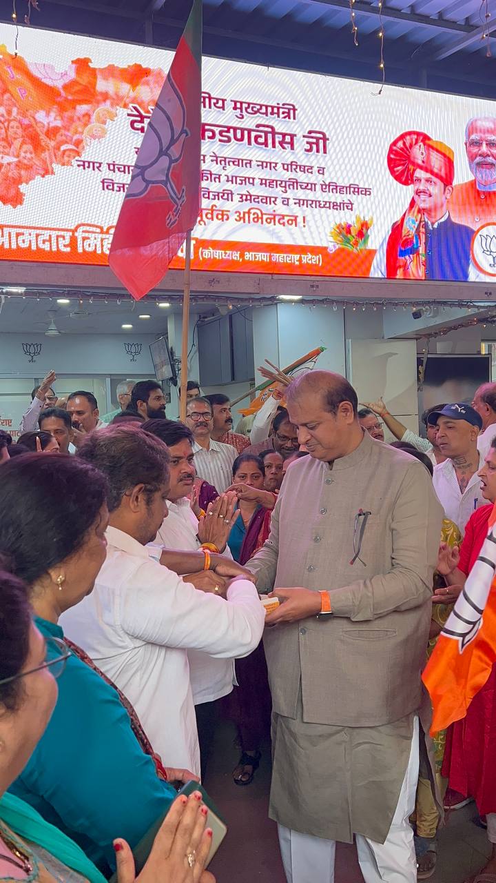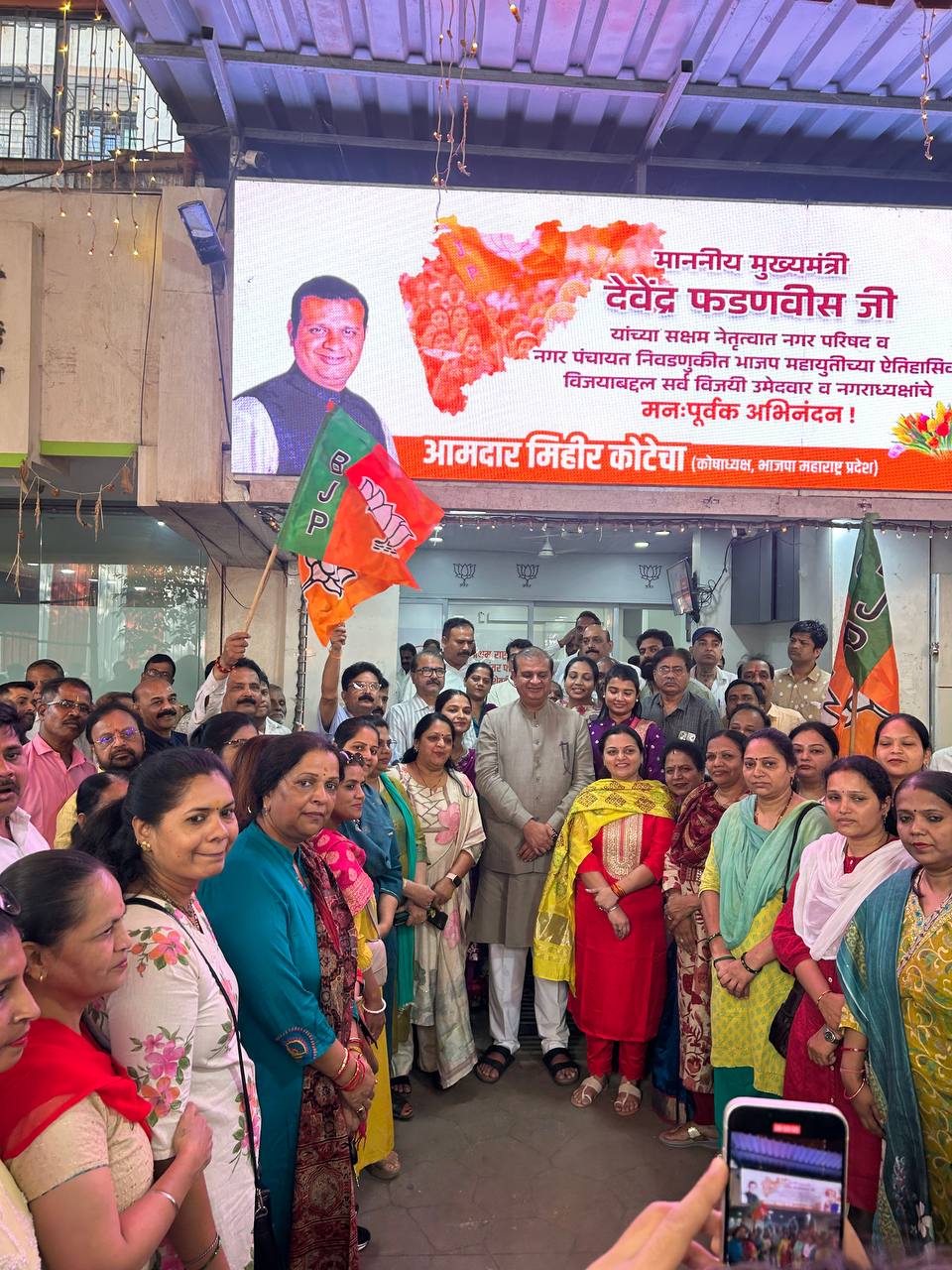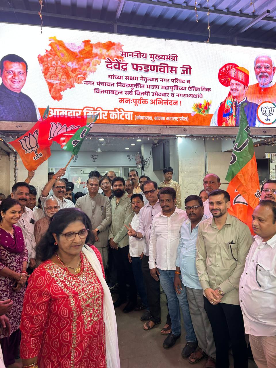 माननीय मुख्यमंत्री श्री देवेंद्र फडणवीस जी यांच्या सक्षम नेतृत्वाखाली राज्यातील नगर परिषद व नगर पंचायत निवडणुकांत भाजप महायुतीला मिळालेल्या दणदणीत विजयाचा जल्लोष उपस्थित कार्यकर्ते व पदाधिकाऱ्यांसोबत उत्साहात साजरा केला.