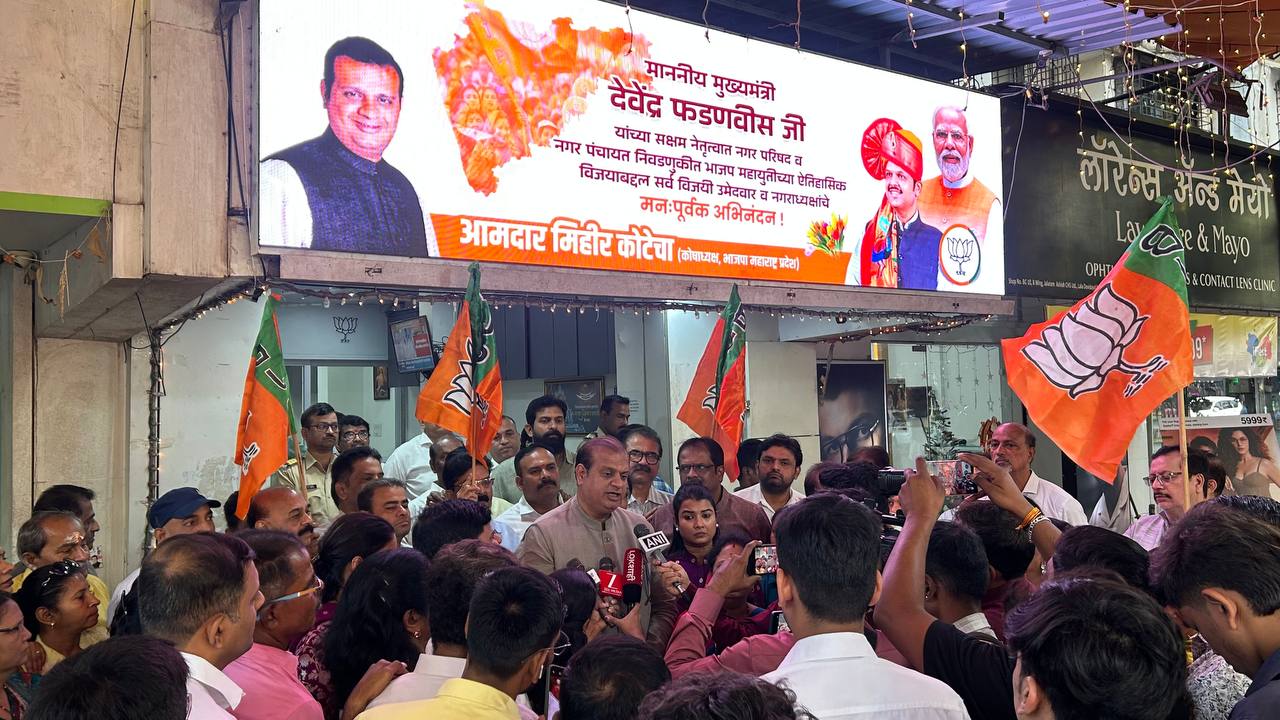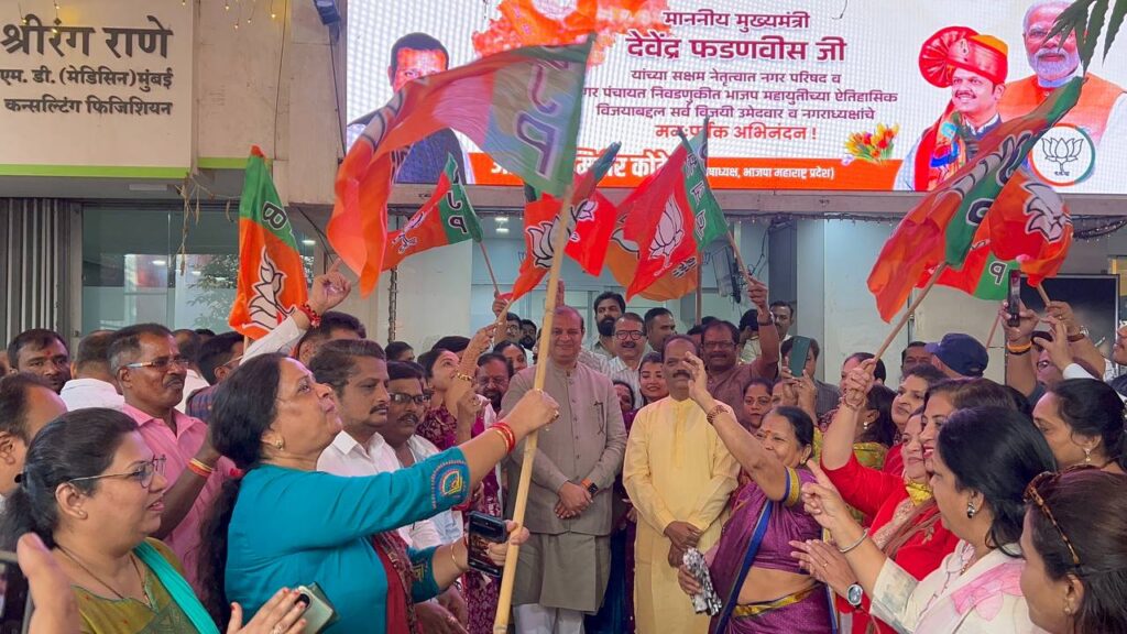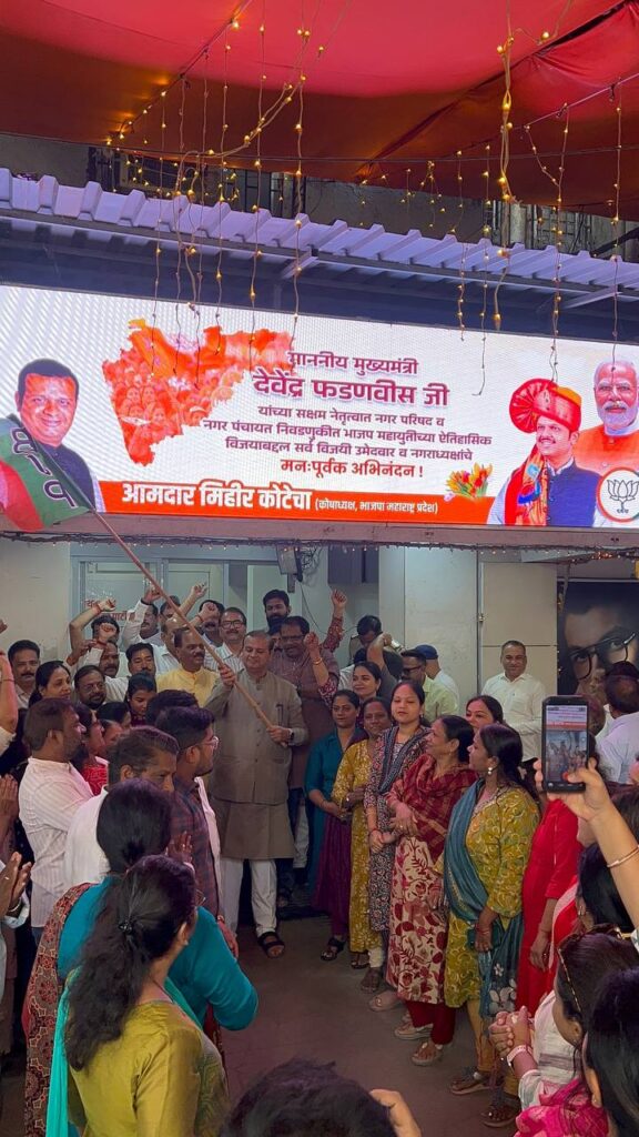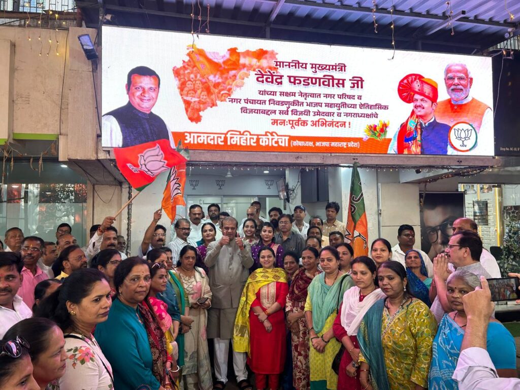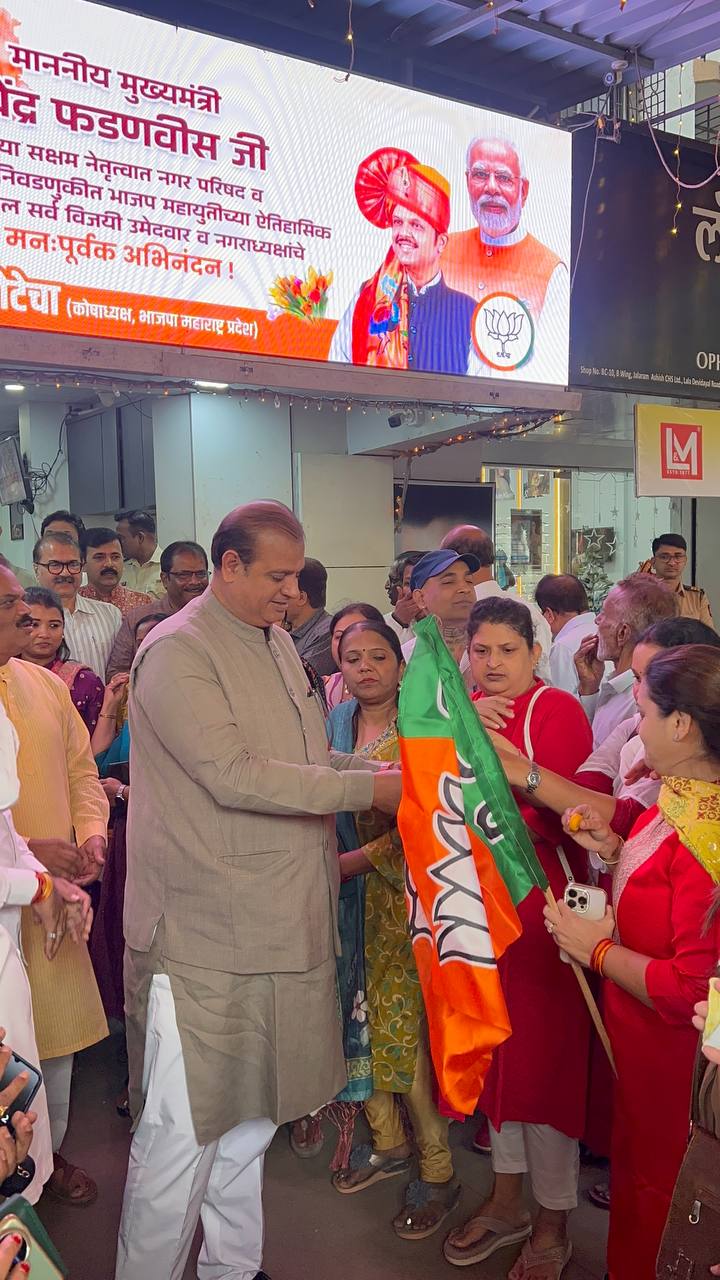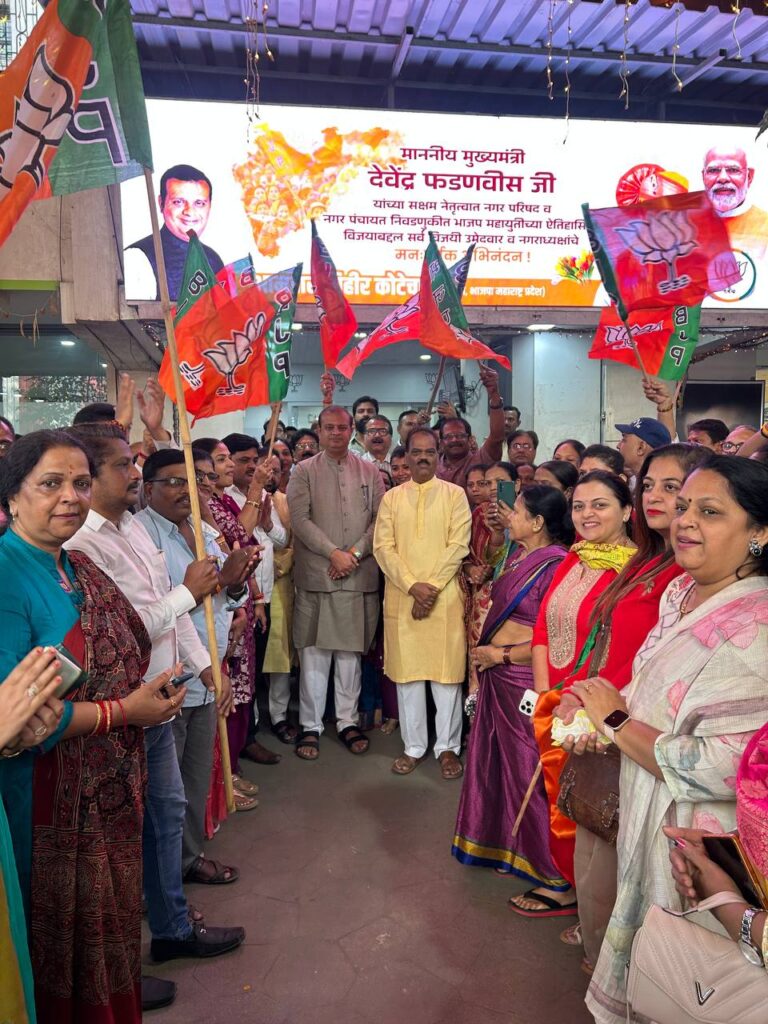 माननीय मुख्यमंत्री श्री देवेंद्र फडणवीस जी यांच्या सक्षम नेतृत्वाखाली राज्यातील नगर परिषद व नगर पंचायत निवडणुकांत भाजप महायुतीला मिळालेल्या दणदणीत विजयाचा जल्लोष उपस्थित कार्यकर्ते व पदाधिकाऱ्यांसोबत उत्साहात साजरा केला.