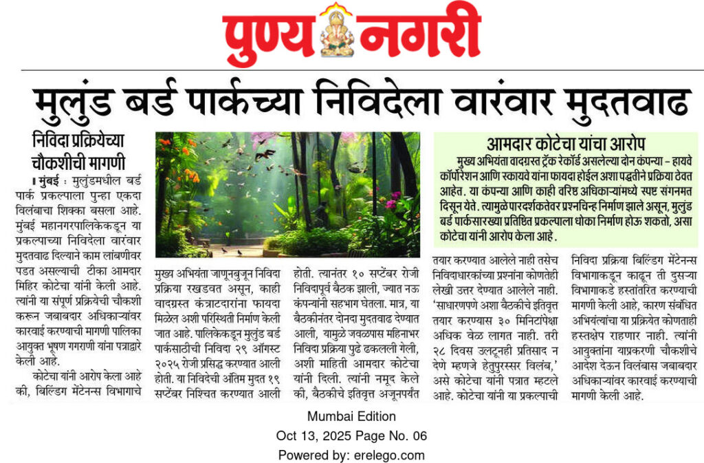 Home Events मुलुंड बर्ड पार्कच्या निविदेला वारंवार मुदतवाढ मुलुंड बर्ड पार्कच्या निविदेला वारंवार मुदतवाढ Date Oct 13 2025 Expired! Time 8:00 am - 6:00 pm Please follow and like us: Share this event + Add to Google Calendar
