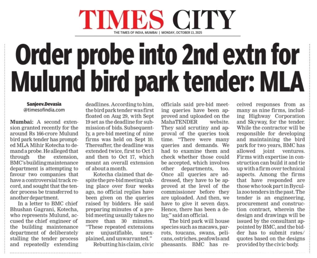 Home Events order probe into 2nd extn for Mulund Bird park tender : MLA order probe into 2nd extn for Mulund Bird park tender : MLA Date Oct 13 2025 Expired! Time 8:00 am - 6:00 pm Please follow and like us: Share this event + Add to Google Calendar